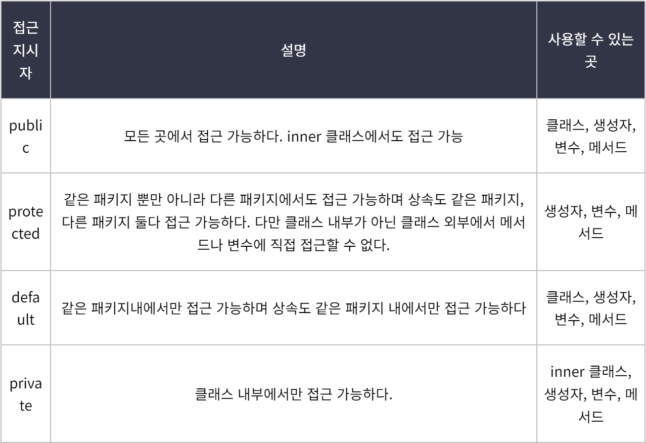 접근 제어 지시자 protected를 선언할 경우 같은 패키지 뿐만 아니라 다른 패키지에서도 접근 가능하며, 상속도 같은 패키지, 다른 패키지 둘 다 접근이 가능합니다. 이 같은 특징은 public 지시자와 유사한 면이 있으며, public 지시자 다음으로 가장 열려있는 지시자 입니다.