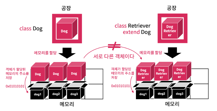 Retriever 인스턴스를 생성 시 부모 클래스인 Dog 클래스의 요소도 포함된 만큼 메모리를 할당하여 적재됩니다. 그리고 참조 자료형 변수는 단순히 인스턴스에 접근할 수 있는 메모리 주소만 저장합니다.