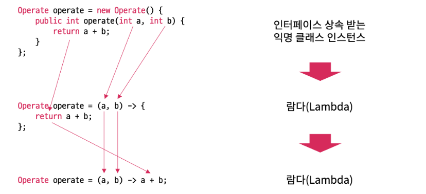 해당 그림은 익명 클래스 인스턴스와 람다와의 연관 관계를 작성한 그림입니다. 변환 과정을 좀 더 한눈에 볼 수 있습니다.